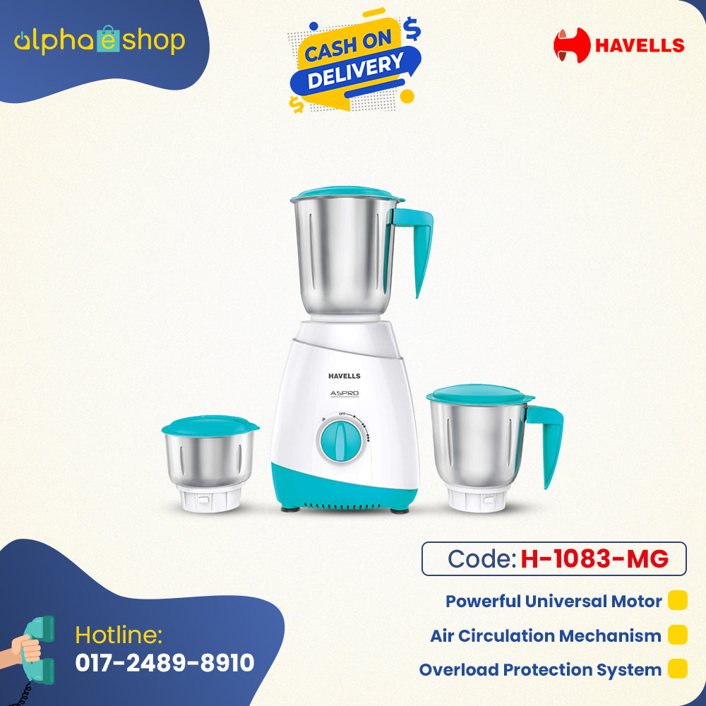 Havells ASPRO 600W Mixer Grinder 3 SS Jars Blue