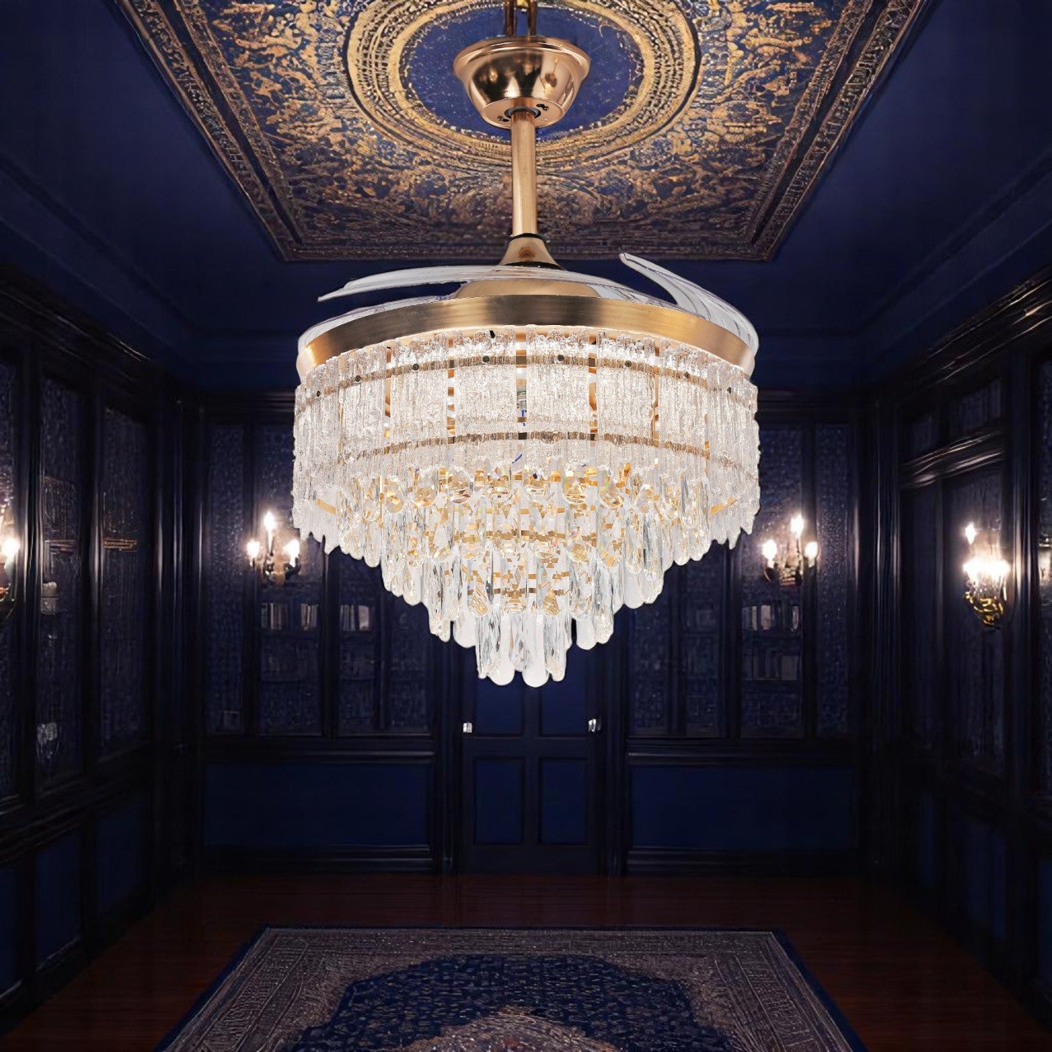 The Qulik Crystal Ceiling Fan - The epitome of elegance and functionality for your indoor spaces. This stunning 48-inch fan features a captivating circular design with K9 crystal embellishments, adding a touch of luxury to any room, be it the Lobby, Kitchen, Bedroom, Study Room, or Dining Room.