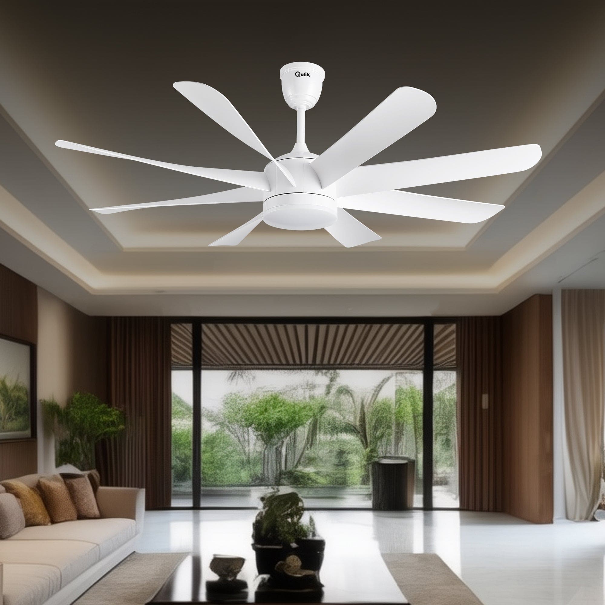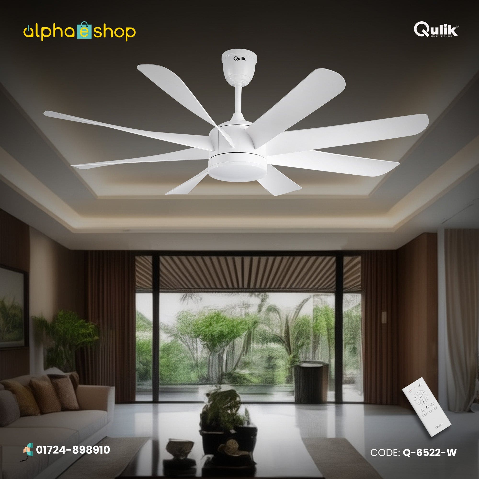Q: What are the key specifications of the Qulik Q-6522-W 60-Inch Ceiling Fan? A: The Qulik Q-6522-W features a European-style design in white, a 60-inch size, and ABS 8 pcs blades. It is equipped with a remote control, a metal ceiling plate, iron blades, a glass lamp shade, and a pure copper winding motor.