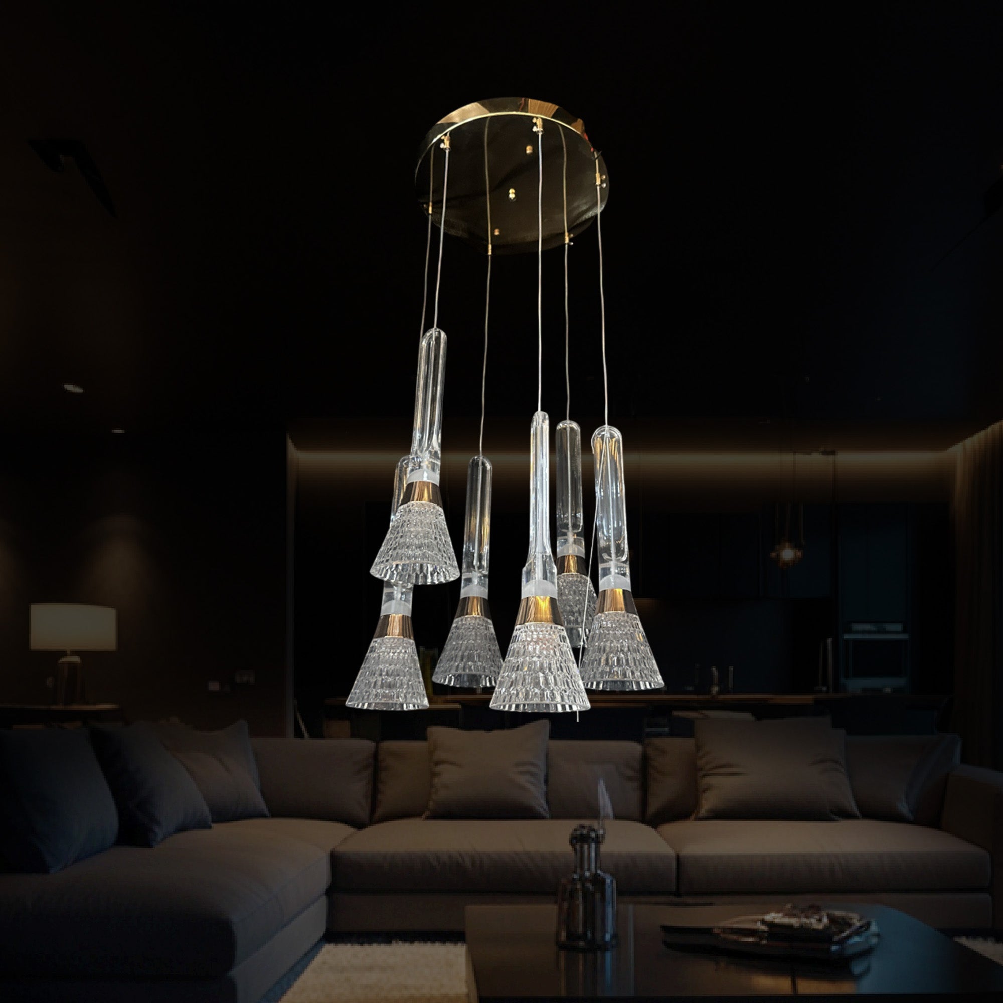 DescriptionElevate your space with the opulent Crystal Cascade Chandelier, a breathtaking design featuring multiple pendant lights with intricately textured crystal shades. Suspended from a golden circular base, this chandelier creates a cascading effect that exudes luxury and sophistication. Perfect for living rooms, dining areas, or grand entryways, its combination of sparkling glass and golden accents provides a stunning focal point. Designed for both style and functionality, this modern masterpiece brings a warm and inviting ambiance to any interior. Illuminate your home with the timeless elegance of the Crystal Cascade Chandelier. |
