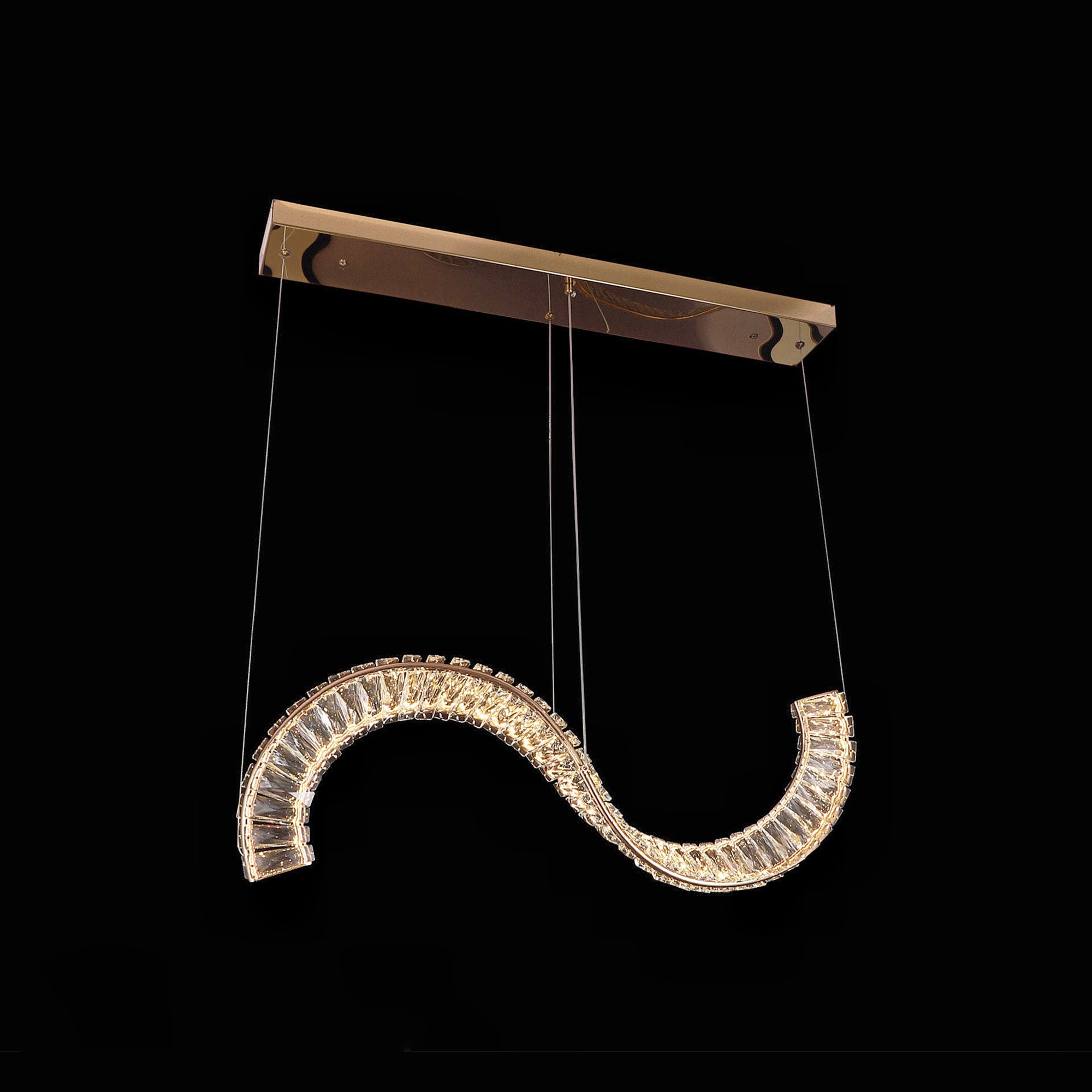 | The Qulik Wave Crystal LED Chandelier features a stunning wave design that adds a dynamic and elegant touch to any room. The crystal embellishments reflect light beautifully, while the gold finish gives the chandelier a luxurious and timeless look. |