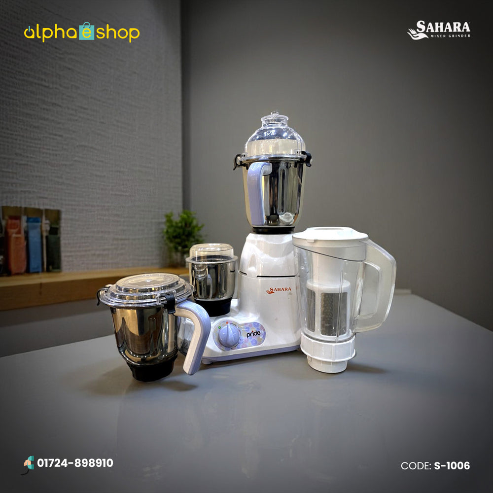 Blender Sahara Pride Mixer Grinder is designed for a convenient, hassle-free operation as well as for fine results making it a must-have in your modern kitchen. This mixer grinder is equipped with a powerful motor that is supported by samurai edge blades ensuring you can grind tough food items easily and quickly. The jars are made of stainless steel and polycarbonate making them long-lasting as well as convenient to clean and maintain. Juicing, blending, whipping, grating, liquidizing, wet/dry grinding, mincing â this mixer grinder lets you do it all. The Sahara products assure quality as their top priority is customer satisfaction through their products and service. Sahara mixer grinder/blender is a great money-saving alternative.
